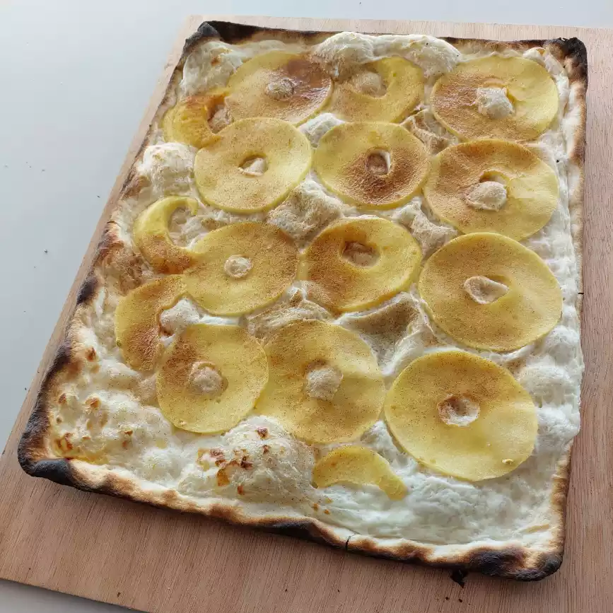 La Tarte aux pommes à l'alsacienne 3,50 €Maison, nappage pudding vanille
